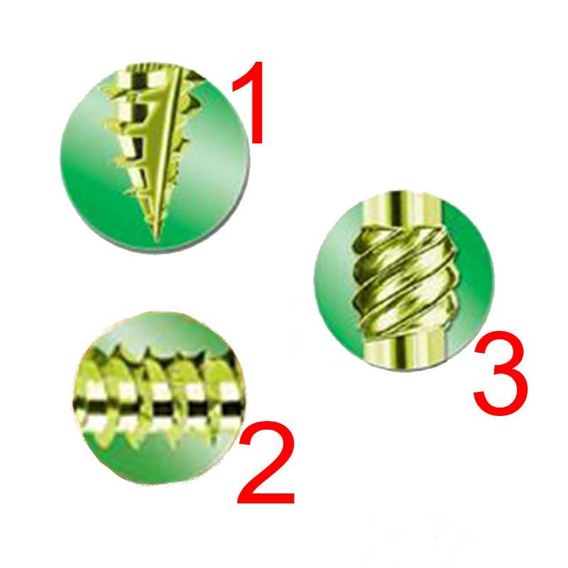 - (3) Το οδοντωτό δεξιόστροφο κοπτικό τμήμα της βίδας ξύλου ρασπάρει την τρύπα στο ξύλο, επιταχύνοντας την διείσδυση της βίδας μετά την είσοδό της στο ξύλο, μειώνοντας την ροπή βιδώματος.